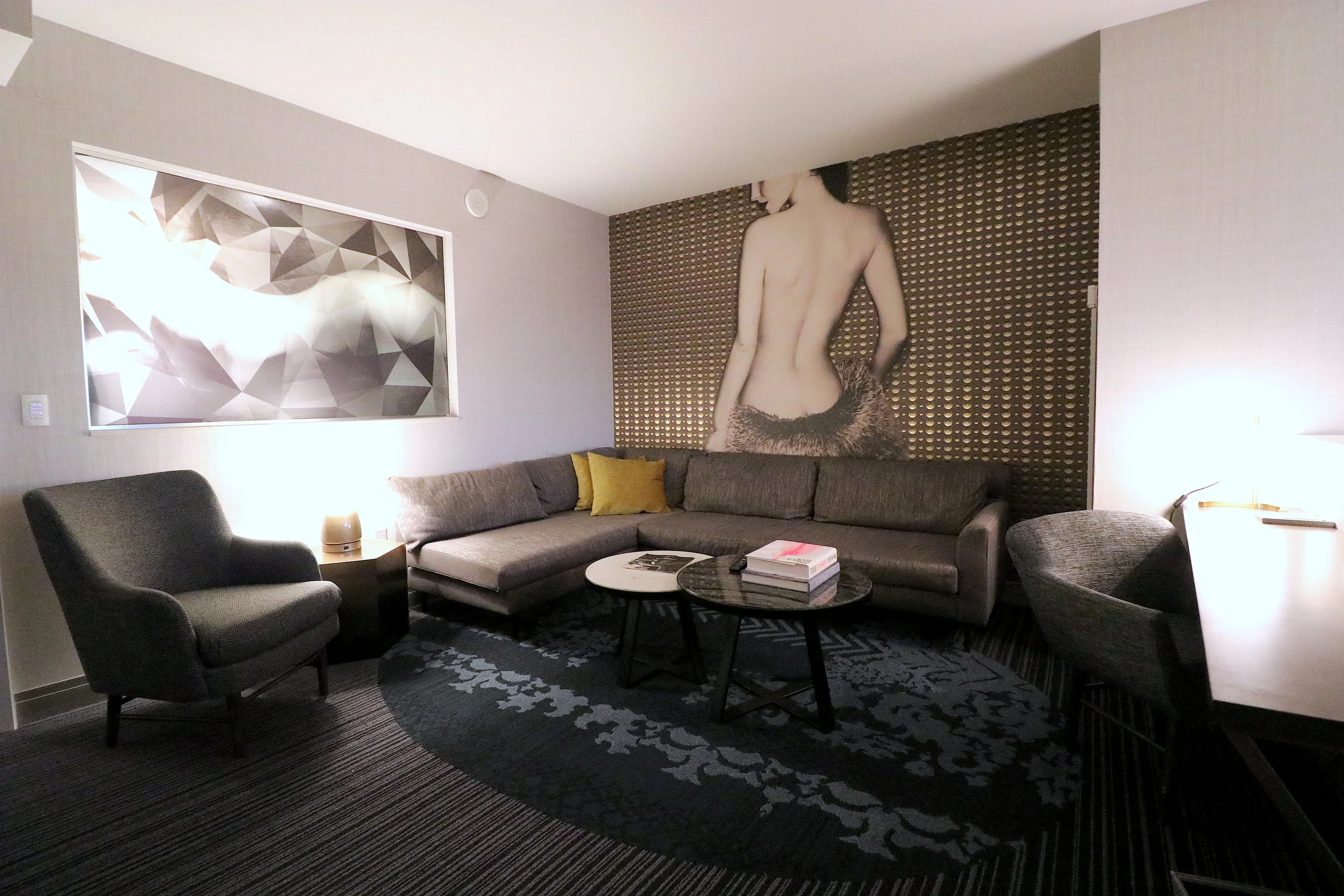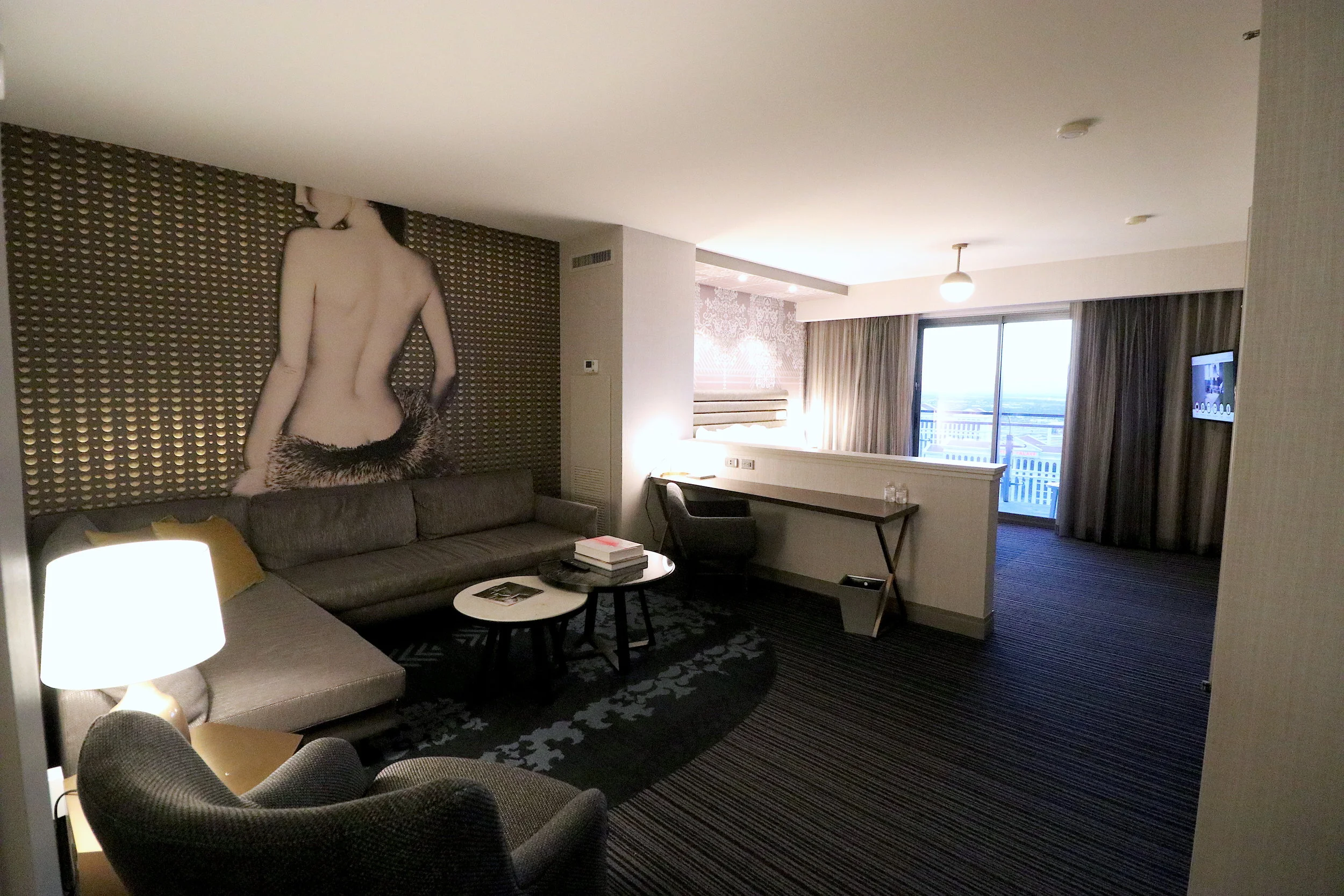 お部屋はかなり広くて、ベッドルームとリビングがロングテーブルでなんとなく仕切られているので、友達が遊びに来ても違和感はありません。テレビもぞれぞれの部屋に一つづつあります。インテリアはエロティックな女性の写真が壁に飾られていれこれまたグラマラス。