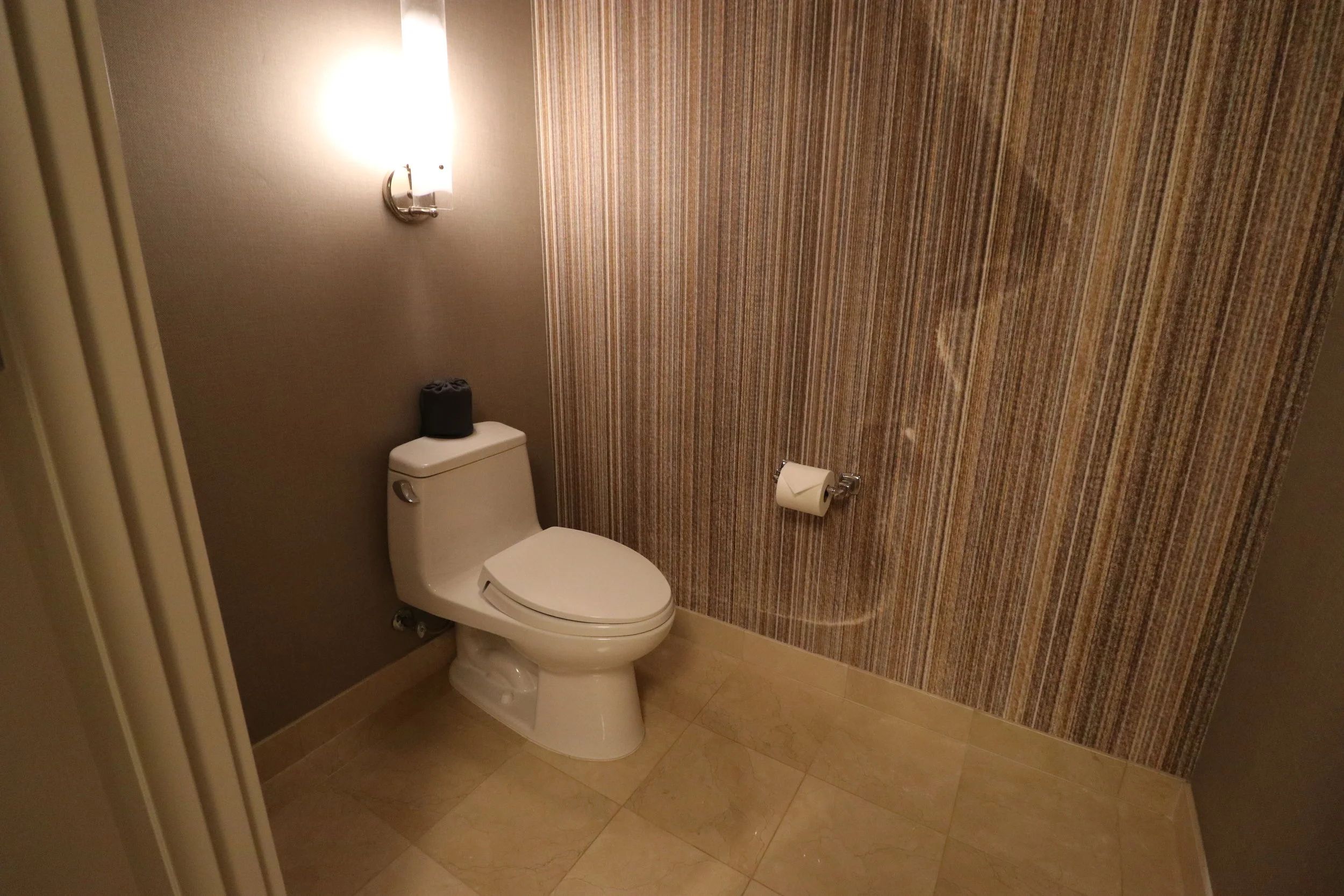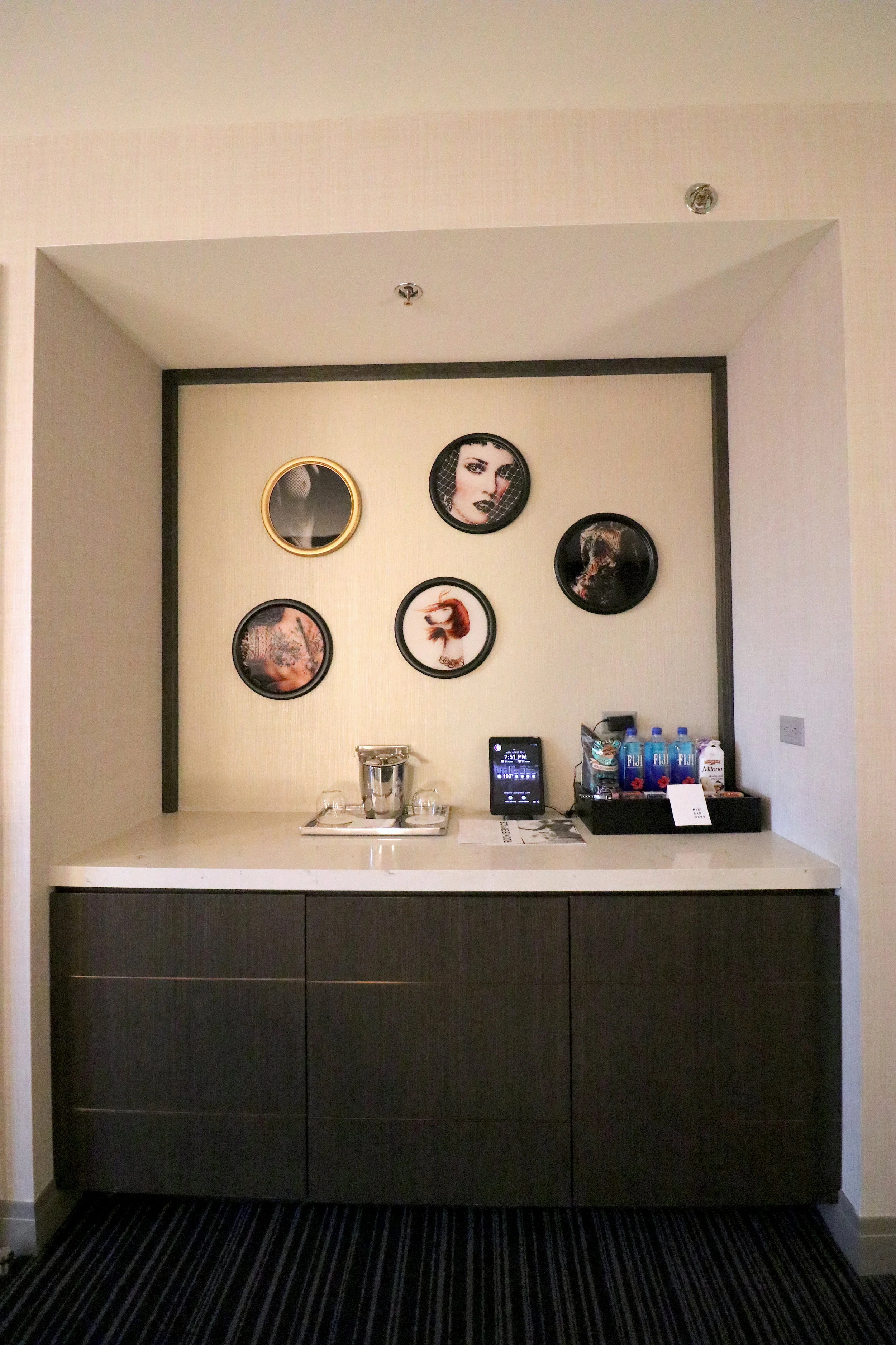 バーエリアはこんな感じ。写真はありませんが、冷蔵庫が二つついていて、一つは有料ミニバー、一つは自分たちのものを入れられるフリースペースになっています。無料の水ペットボトルなどはもらえないので、来てすぐにCVSやWalgreensなどのドラッグストアでストックしておくのが安心です。館内のジムにウォーターサーバーがありますが、ペットボトルに入れて飲んで見たら死ぬほどまずかったのでおすすめしません。