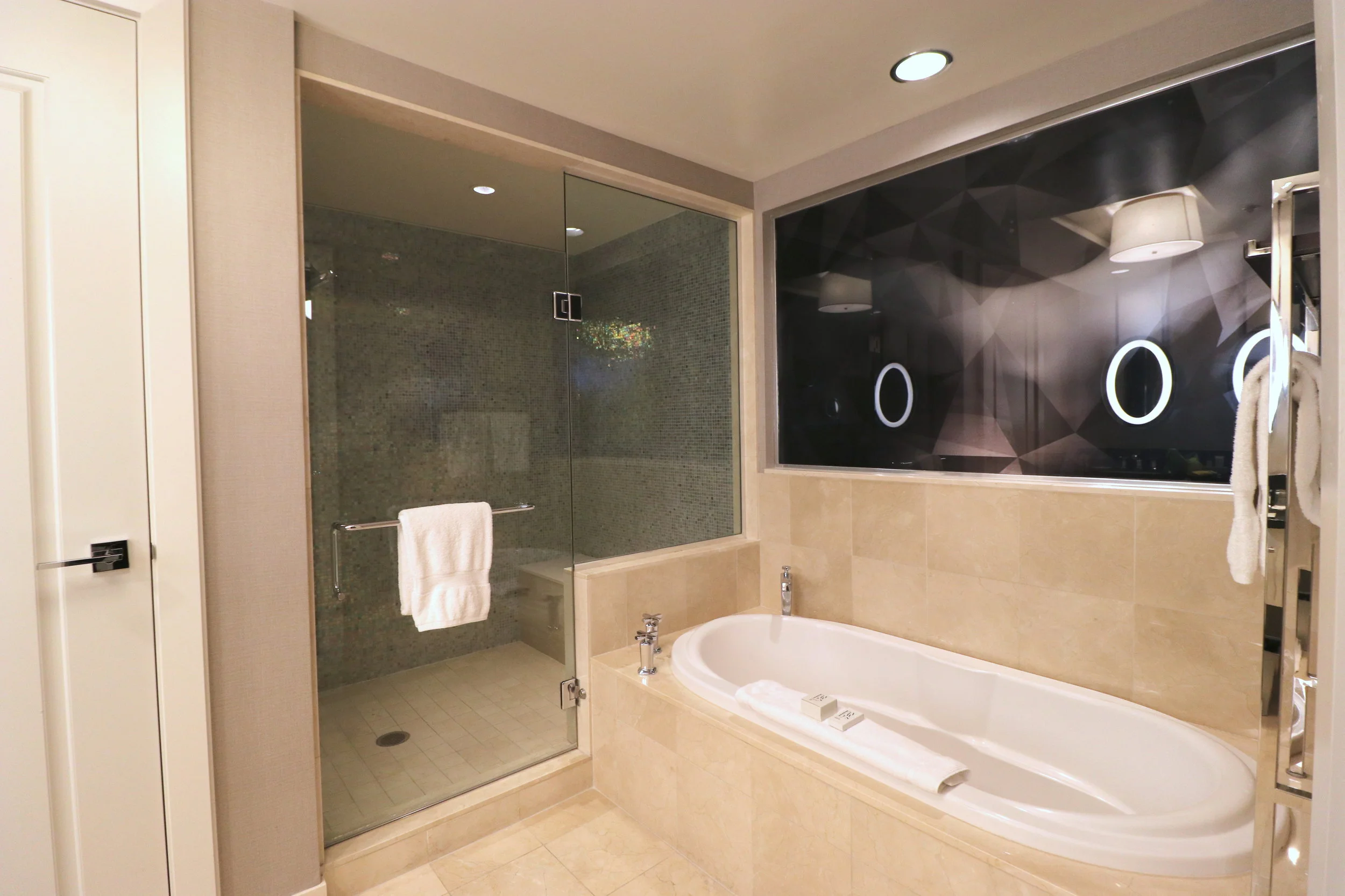 私たちがコスモポリタンに泊まりたかった一つの理由に、「ベラジオのウォーターショーを上から観れる」と言う点があったので、テラスからベラジオのファウンテンが見下ろせるこのお部屋を選択。景色も最高だし、ショーいろんなバリエーションがあって、毎日何度見ても飽きることなし!私は普段ホテルからの景色ってあまり重視しないんですが、このストリップの景色は最高だったな〜。