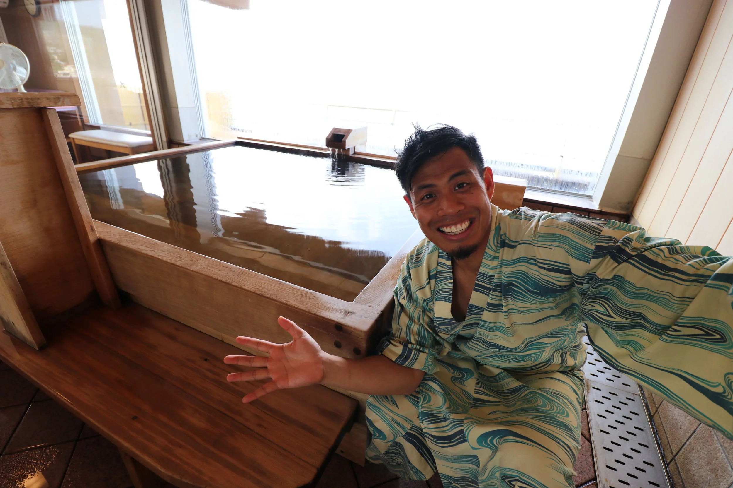 The outside bath was also quite big - big enough for tall guys. The windows around the bath are closed in the picture but when you open it up, you can enjoy the sea breeze while taking a bath!