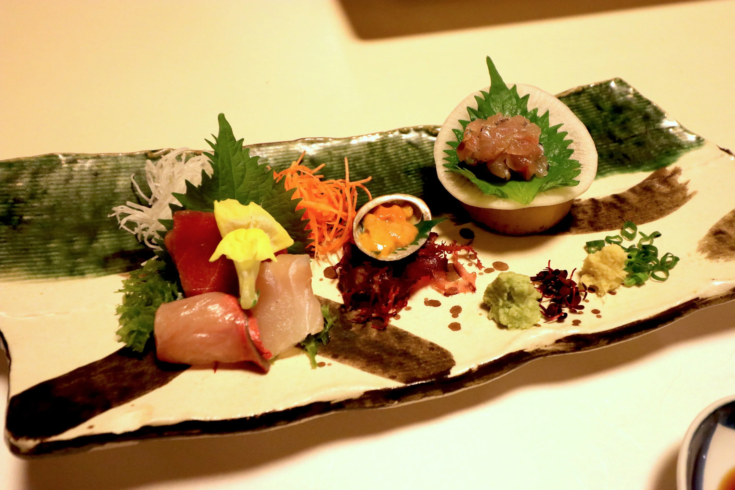 Dinner was mainly seafood and served in course. It started with appatizers of small squid, turban shell, sesami tofu, sea bream sushi, grilled Ise shrimp, eel soup and plum wine. everything was good!